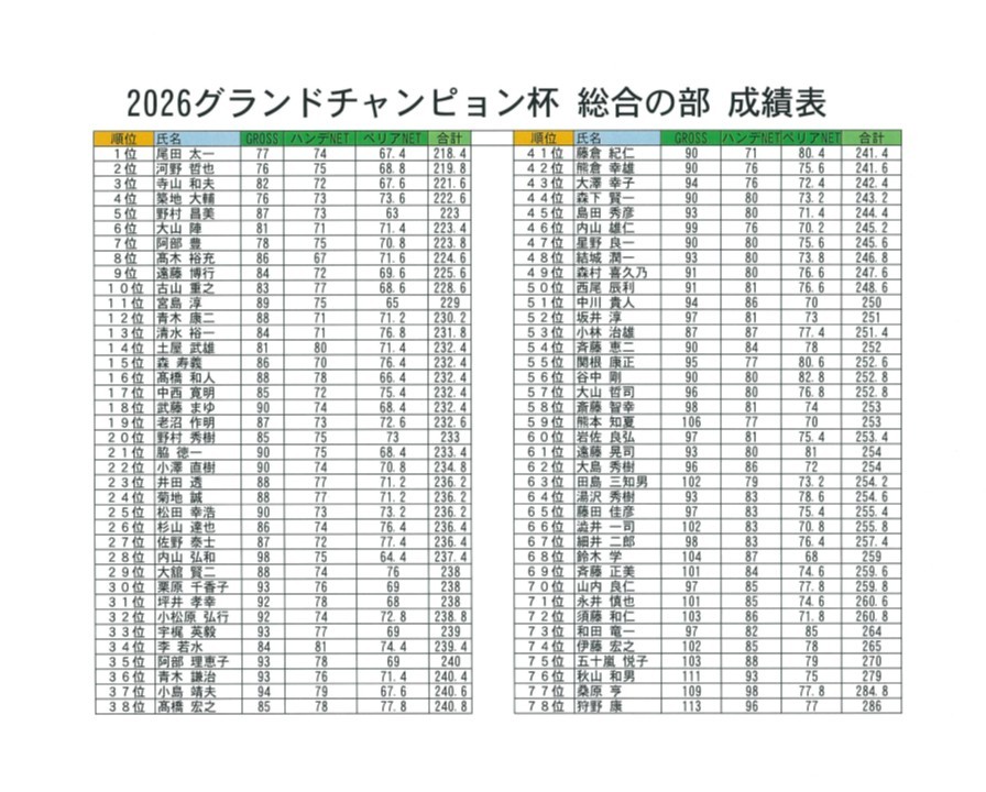 2025グランドチャンピョン杯総合の部成績表